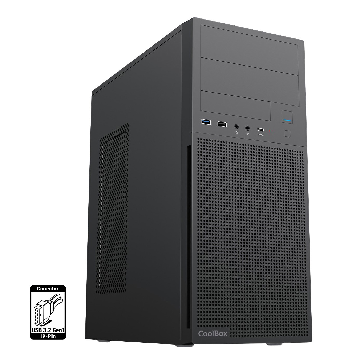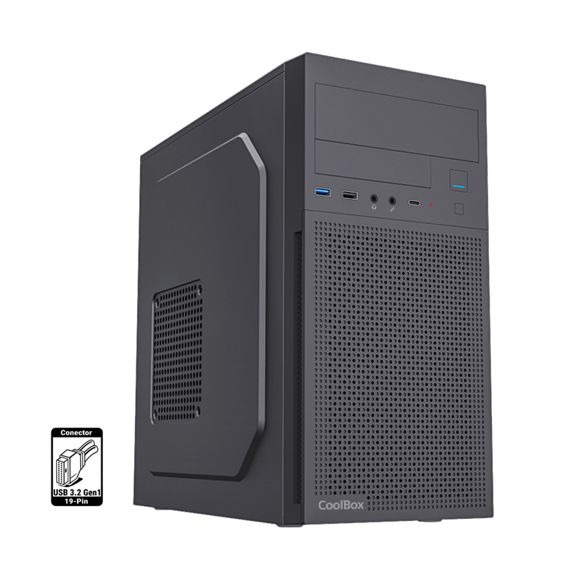 Bahías int.: 2×3,5", 3×2,5" / USB3.0 + USB2.0 + USBC / Audio HD / MiniTorre con fuente ATX 500W incluida.