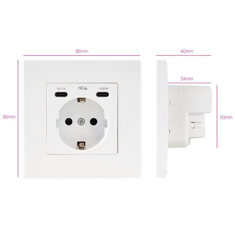 Enchufe empotrable CEE 7/3 + 2× USBC QC/PD 20W / 16A250V / Blanco