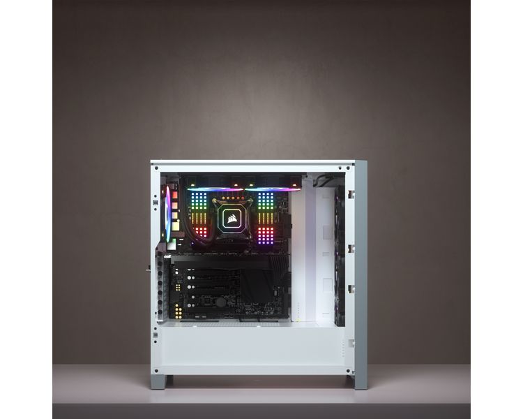 Incluye dos ventiladores CORSAIR AirGuide de 120 mm, con aspas antirremolinos que concentran el flujo de aire y mejoran la refrigeración.