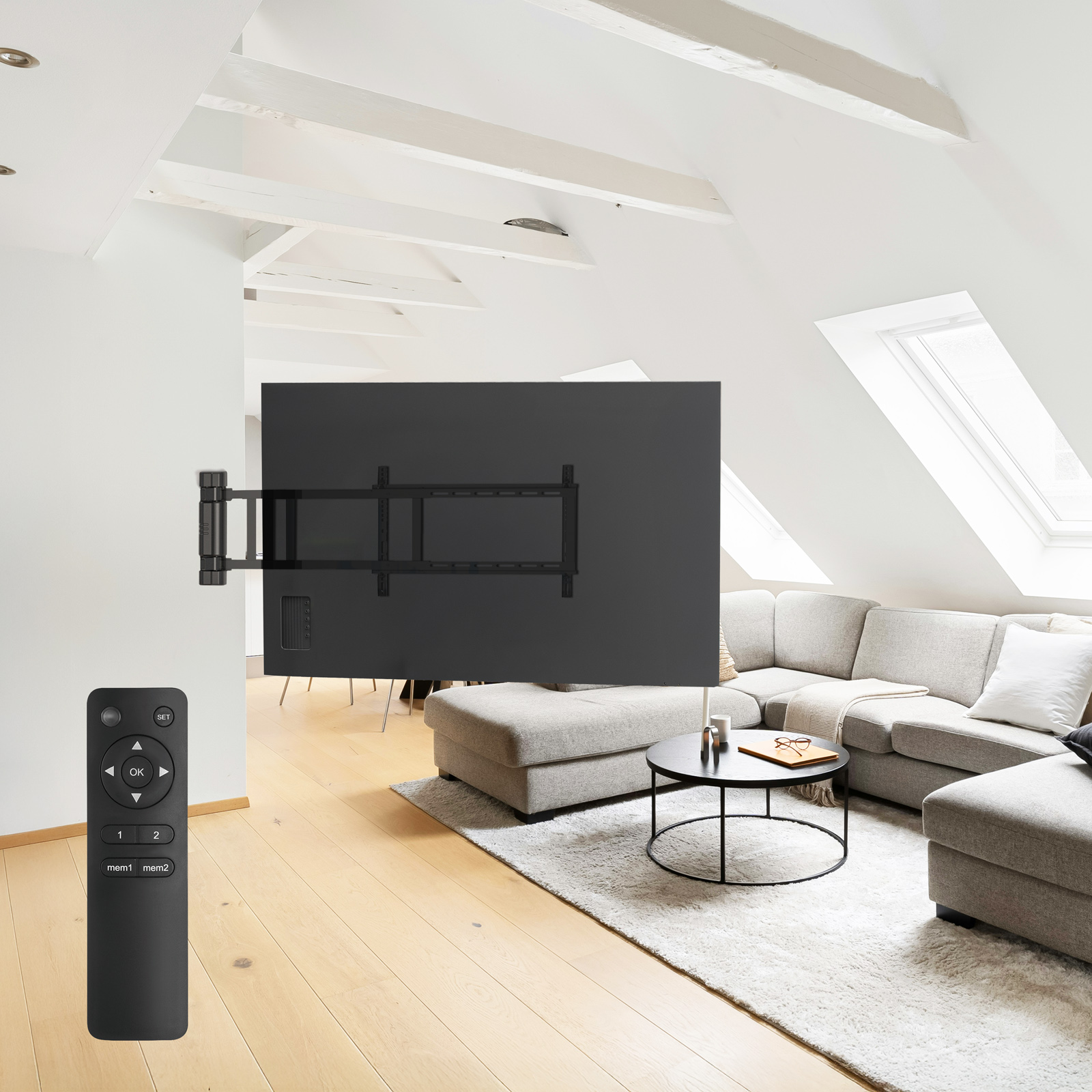 Soporte de pared eléctrico para TV 32″–75″ con mando y memoria de posiciones.